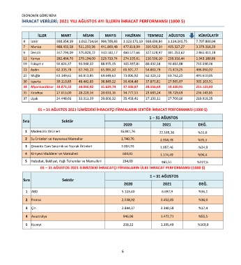 01 – 31 AĞUSTOS 2021 İLİMİZDEKİ İHRACATÇI FİRMALARIN SEKTÖR İHRACAT PERFORMANSI (1000 $)